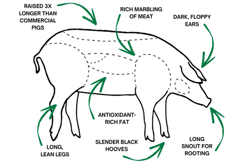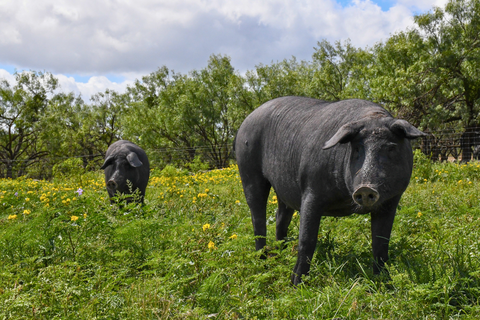 Our 100% Iberico pigs thrive in the native landscape of the Texas Hill Country. In addition to premium feed, the pigs forage on mesquite beans, acorns, yucca, and prickly pear cacti. Rancher raised in wide open spaces for up to 18 months, nearly three times longer than commercial pigs. The result is a deeply marbled pork - unmatched in quality and flavor.